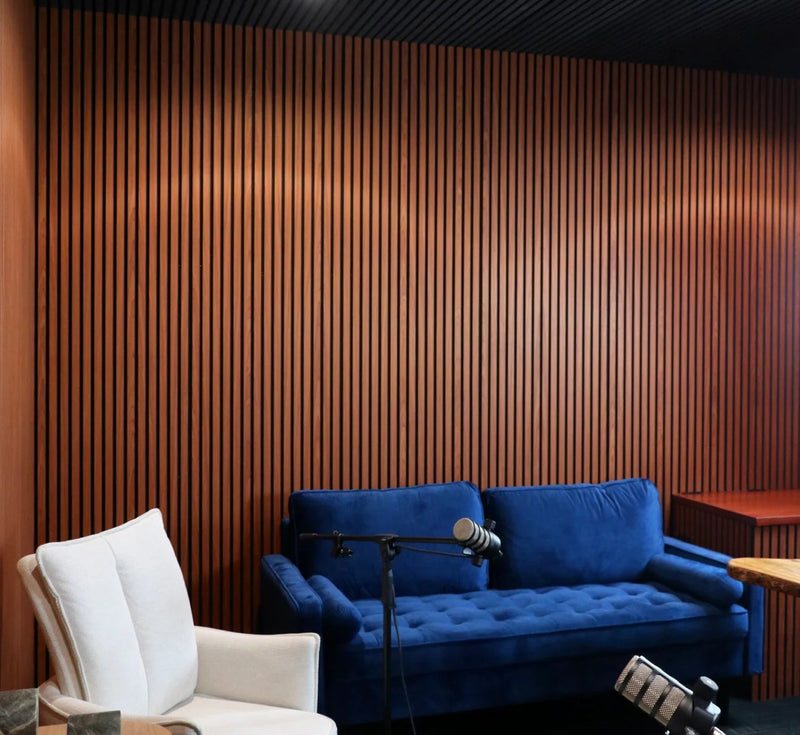 In this podcast studio, a custom American Cherry panel was applied to the walls, while the ceiling features our Jet Black finish, enhancing both sound quality and aesthetics.